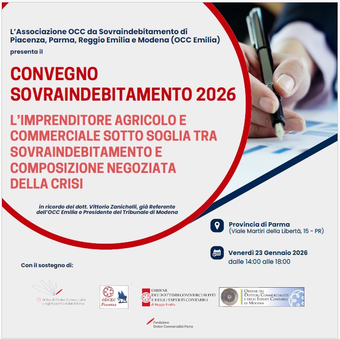 L’ Associazione OCC da Sovraindebitamento dei Commercialisti di Piacenza, Parma, Reggio Emilia e Modena (OCC Emilia), organizza la seconda edizione del CONVEGNO SOVRAINDEBITAMENTO 2026